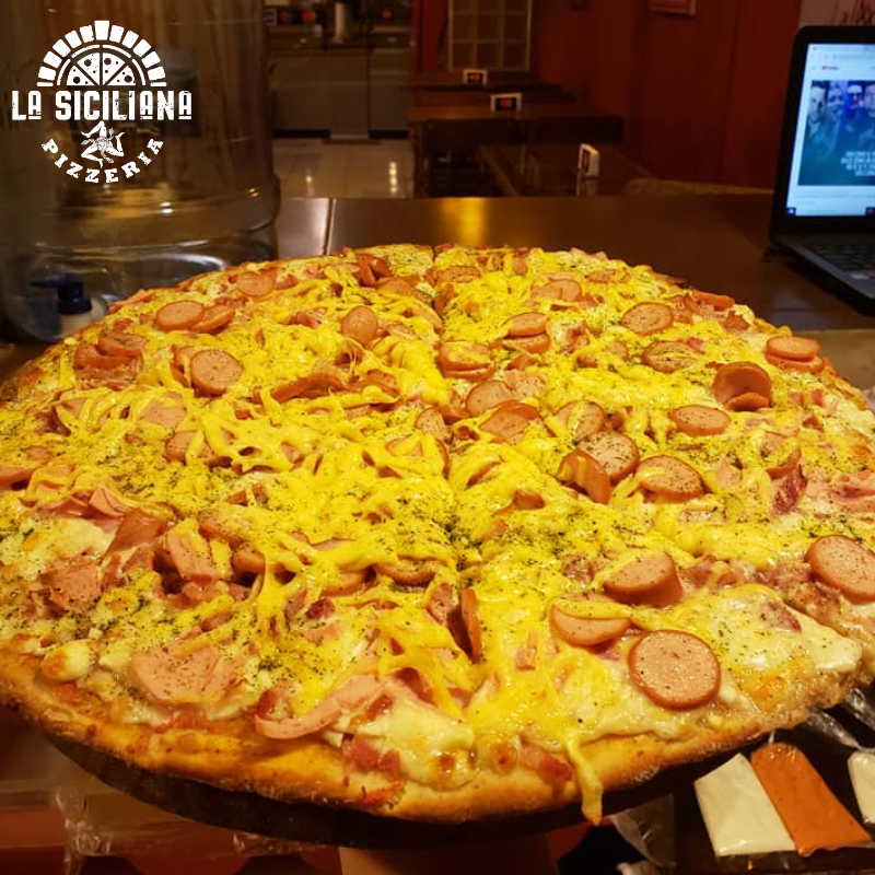 Una de las favoritas de la casa: abundante queso fundido, salchichas tipo frankfurter en rodajas, jamón en tiras, un toque de orégano y condimentos especiales sobre nuestra clásica masa artesanal.